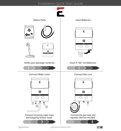 - What's Included: Eccotemp EL5 Portable Tankless Water Heater, Ecco Spray 3 spray shower headset, carrying bag, 3 ½" CSA certified gas regulator and hose, mounting hardware, and garden hose quick connect and adapter