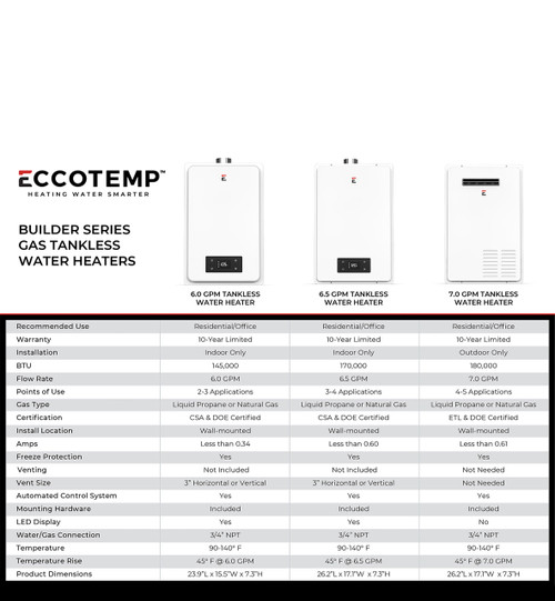 - The 6GB Builder Series is designed for indoor installation only and requires 3-inch venting. Make installation a breeze using the Eccotemp 3" Horizontal Vent Kit or 3” Vertical Vent Kit (purchased separately).