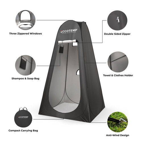Transform the Ecco Tent into an outdoor shower with an Eccotemp Portable Water Heater and Ecco Spray Showerhead Set, a private changing room, or even a spray tan booth. Its versatility is unmatched, accommodating uses such as camping, off-grid living, hunting camps, lakeside fishing, overlanding and hiking, changing room, porta-potty, fashion shows, spray tan booth, sun shield, photo shoots, and more!