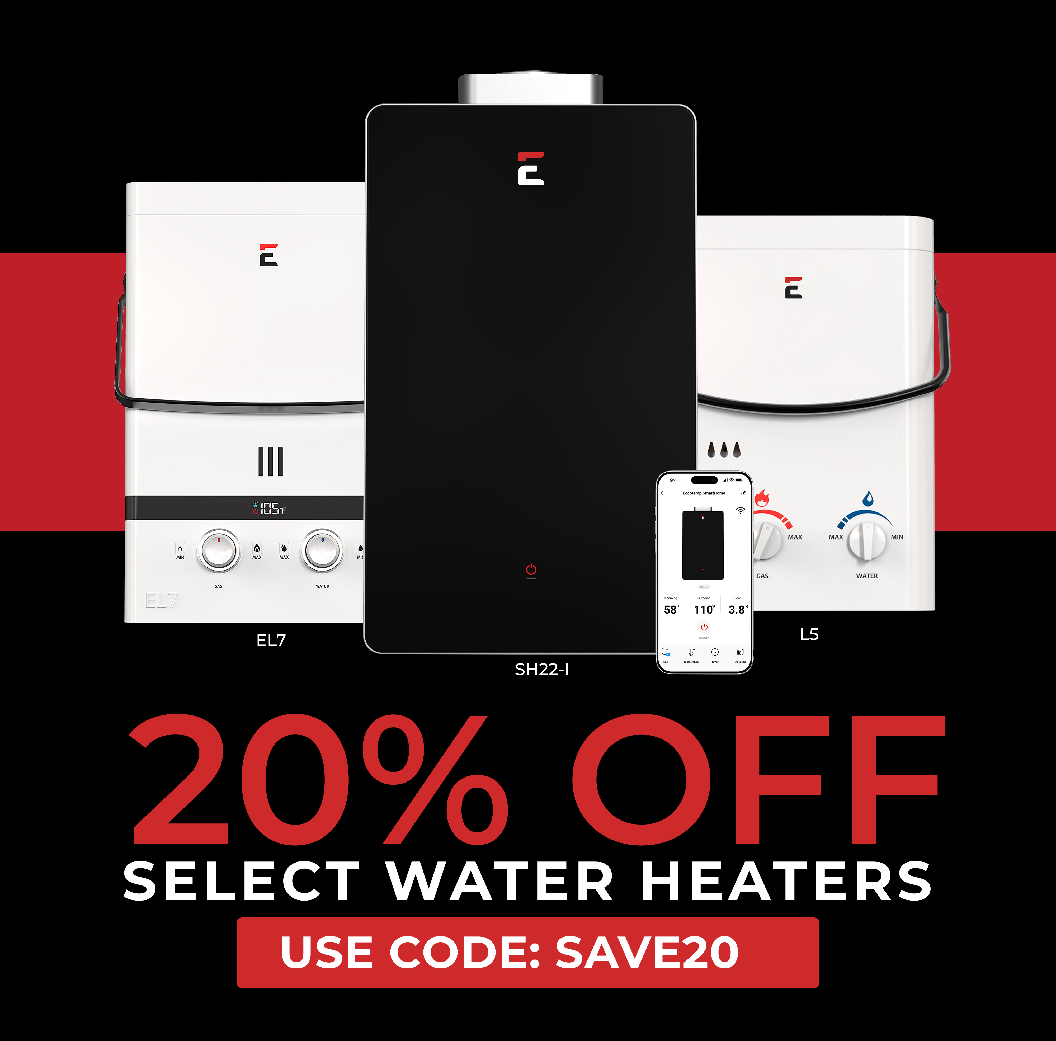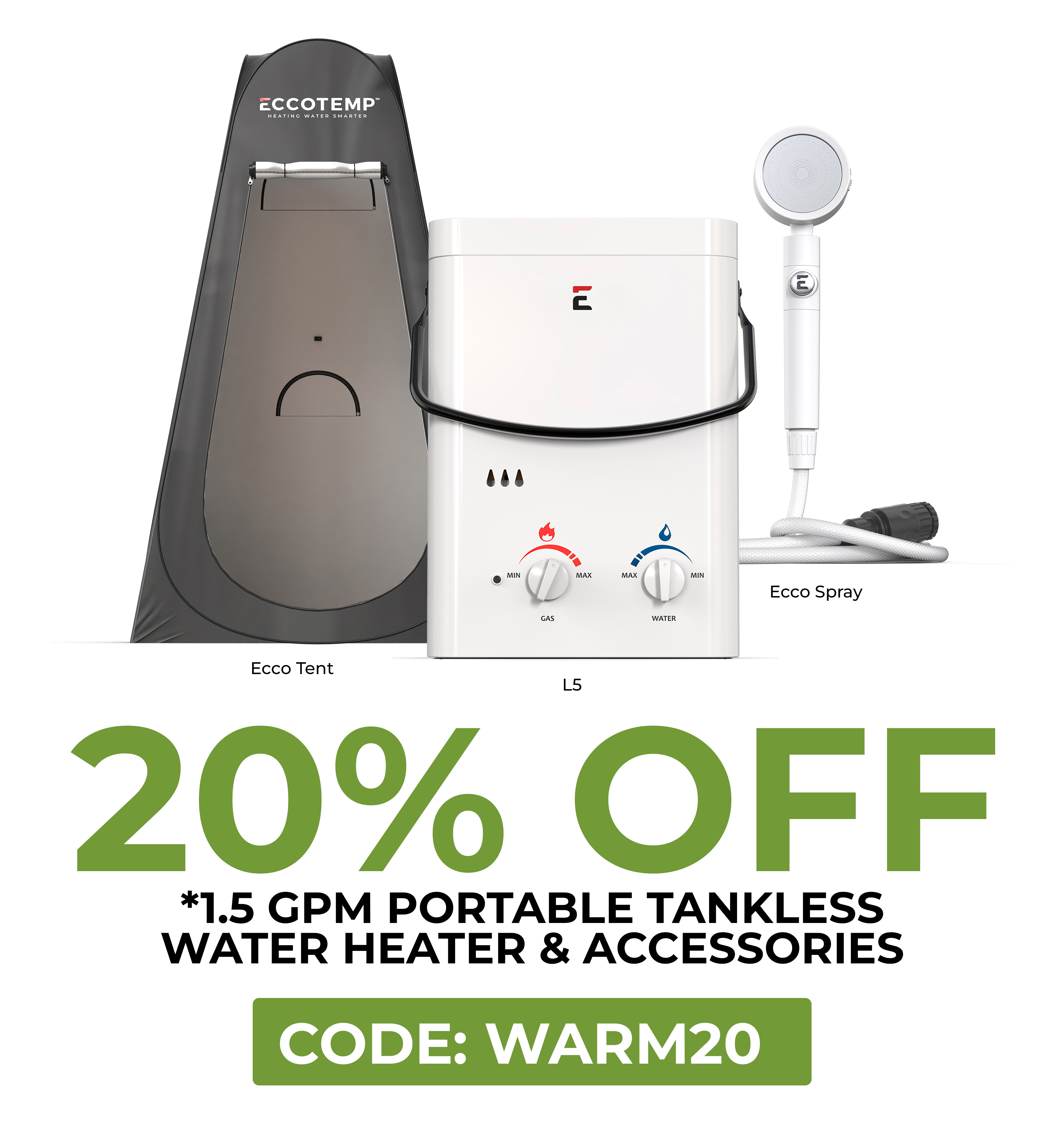 *Social media coupon codes: Coupon code for 15% off first new Portable water heater order. Excludes parts and accessories. Cannot be combined with any other promotion, discount, or coupon code. Applies to new retail orders only on www.eccotemp.com.