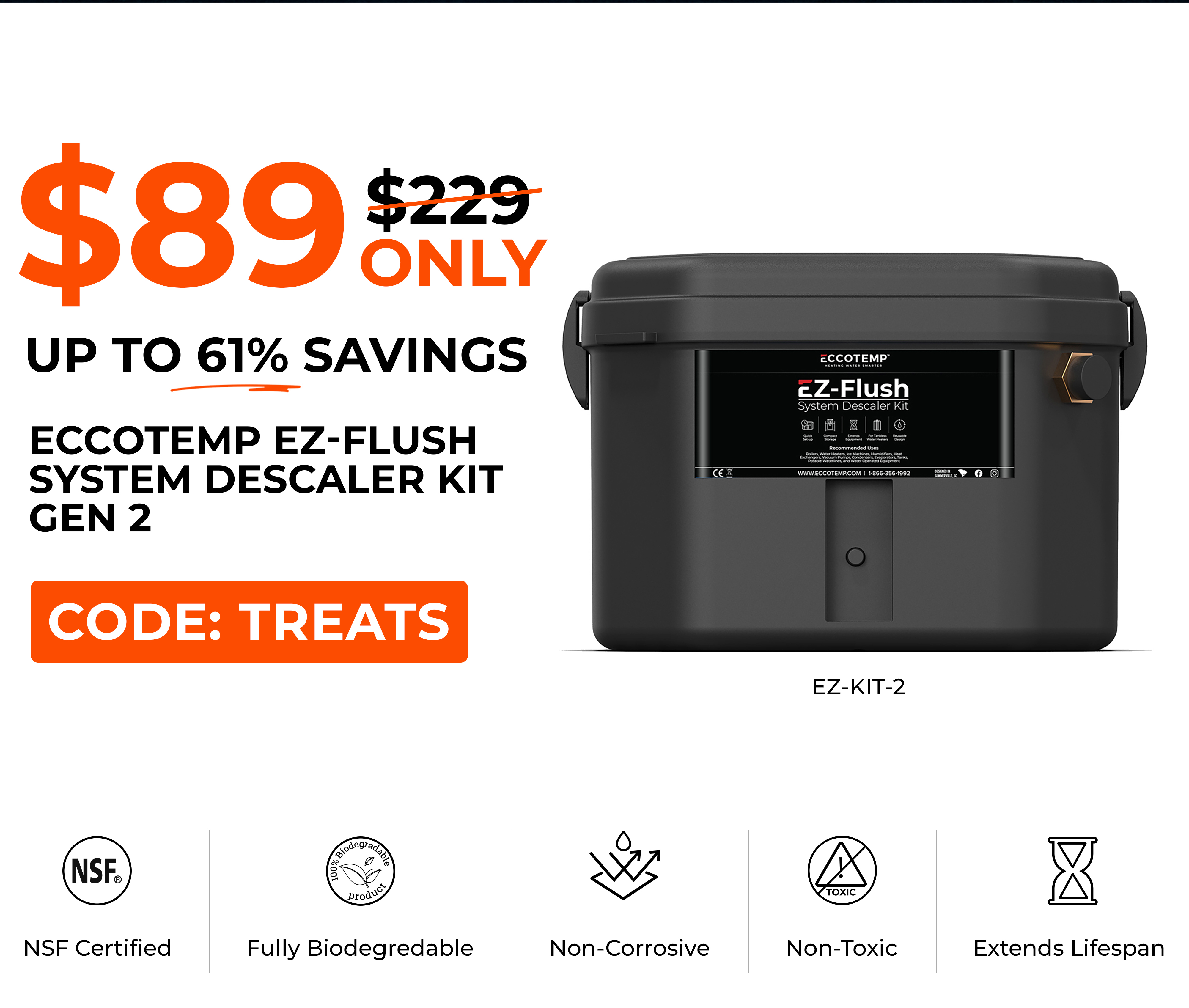 *Save $140 off on EZ-Flush System Descaler Kit (EZ-KIT-2). The website may not reflect the most current inventory levels. Excludes other water heaters, add-ons, open box, scratch & dent, accessories, other protection plans, parts. Hurry! While supplies last. These promotions are exclusive and cannot be used in conjunction with any other promotion. Only valid for new US retail orders purchased on www.eccotemp.com. For additional details, visit our promotions page. Please note that Afterpay is not available for preorders. For more information on Afterpay, check out this link. Images are for illustrative purposes only. Free ground shipping is available for orders $149 or more only within the contiguous United States. Same-day shipping is usually available if orders are placed by 2 p.m. Monday-Friday (excluding holidays); however, it may take up to 72 hours. Due to current shipping delays, please be aware that estimated delivery dates for back-ordered items are subject to change. In the event that you select add-on 'Options' that are out of stock, we will hold the entire order and ship it as a complete package once every item is in stock. This approach guarantees that your order arrives complete, avoiding any partial deliveries. Copyright 2025 Eccotemp. All Rights Reserved.